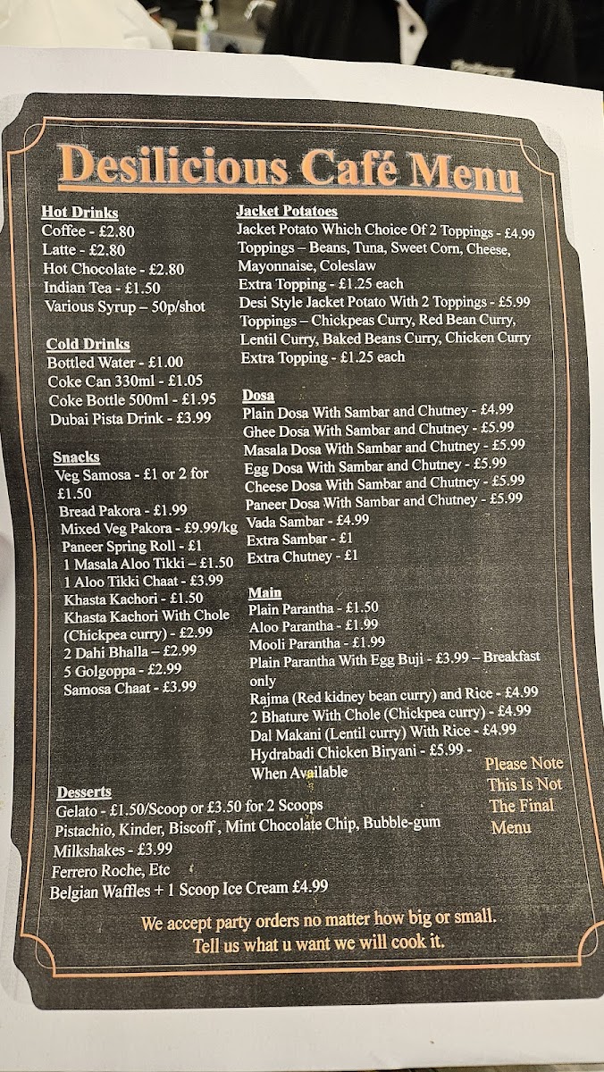 Welcome to Desilicious Café, a delightful culinary gem nestled at 82 Queens Rd, Nuneaton. This cafe brings the vibrant essence of Indian cuisine to life, offering an extensive menu that caters to both North and South Indian tastes. Among the must-try snacks, you’ll find crispy Veg Samosas and Paneer Spring Rolls that embody authentic flavors. The Dosa selection is equally impressive, featuring classics like Masala Dosa paired with aromatic sambar and chutney.